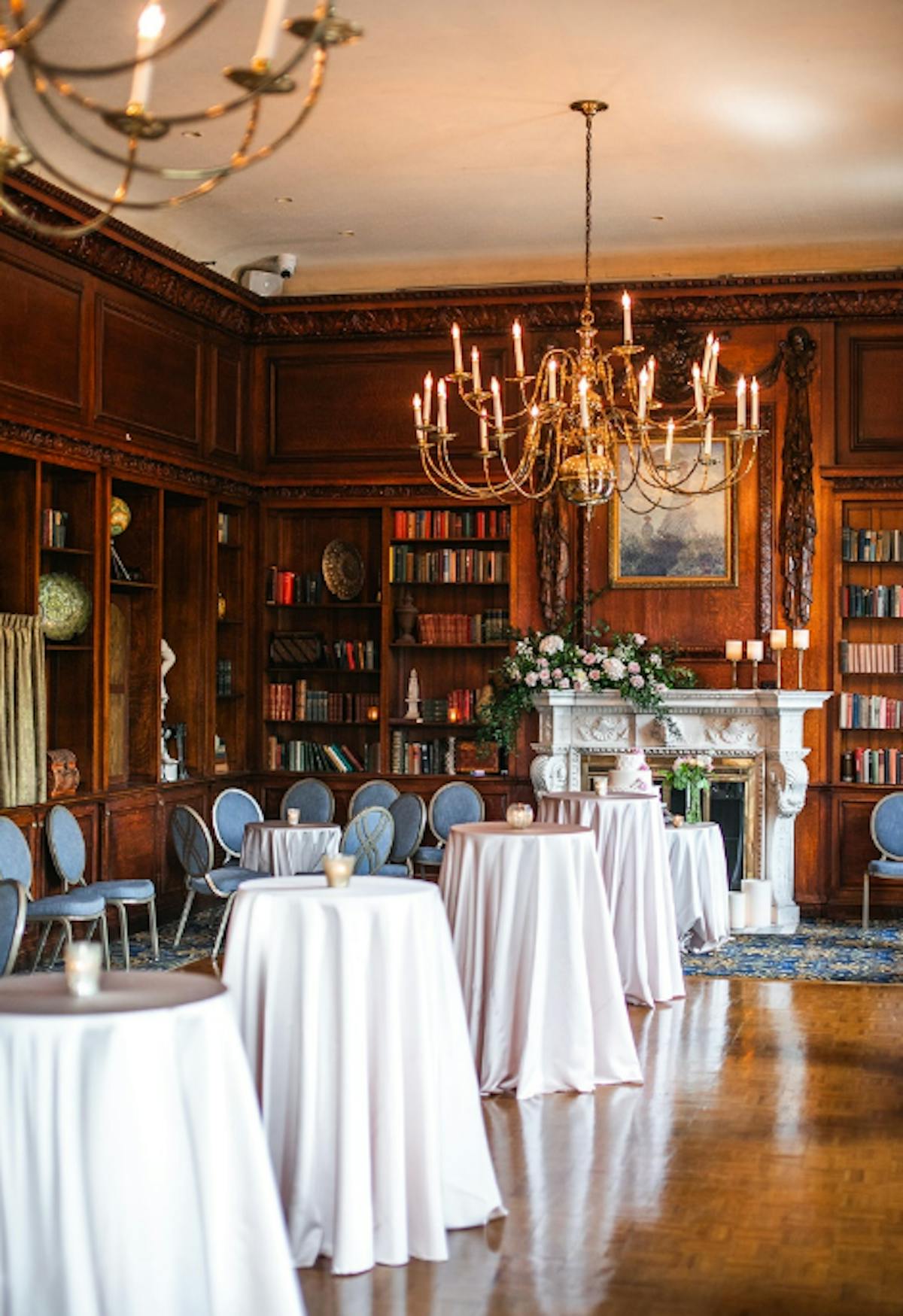 For florals, think deep purples and anemones for the spring; in the fall, lean into those darker-toned dahlias. Consider jet black chairs to match the theme and, in our Grand Library, surrounded by bookshelves and the extraordinary brass chandeliers, your guests are sure to feel transported.